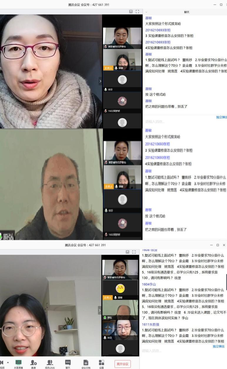 最后,徐芬、原弘、聂敏在互动环节就考研复试时间、实验课重修、社群学分、系统学分与实际学分不匹配、毕业设计安排等提问,与学生们进行了充分交流并逐一回答,累计回复学生和家长提问101条(包括调查问卷和视频答疑),努力保障线上毕业就业工作的平稳开展。