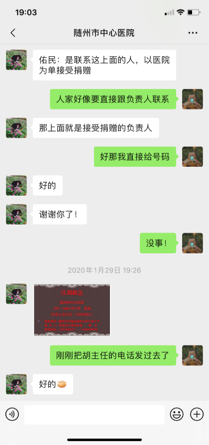 湖北省作为本次疫情的重灾区,除外界聚焦的武汉外,其他城市也深受新型冠状病毒的影响,随州便是其中之一。在严重的疫情与短缺的医疗资源之间,王佑民和其他志愿者们用网络搭起了一座物资调配的桥梁。“作为湖北人,对这次疫情一直比较关注,一直想找机会贡献自己的力量,所以当我在朋友圈看到为家乡联系医疗物资调配的志愿者招募信息后,就毫不犹豫地加入了。”通过远程线上办公,他扮演着物资捐赠方与告急医院的对接窗口,为疫情重灾区的随州市曾都区中心医院和随州市长岗镇长岗卫生院争取到了紧缺的医疗物资,缓解了这两所医院物资紧缺的状况。同时也因为有他们的存在,物资对接效率大大提高。在谈到这次志愿活动的困难之处时,王佑民则不以为意。“困难倒说不上,关键是能为家乡医院争取到紧缺的医疗资源,这就让我很开心了。”除了能为家乡作贡献以外,他也在这次辗转交流的物资交接战中,锻炼和提升了自己的沟通协调能力,在一个时时刻刻忙碌交接物资的志愿群里,感受到了疫情下爱的芬芳氤氲。