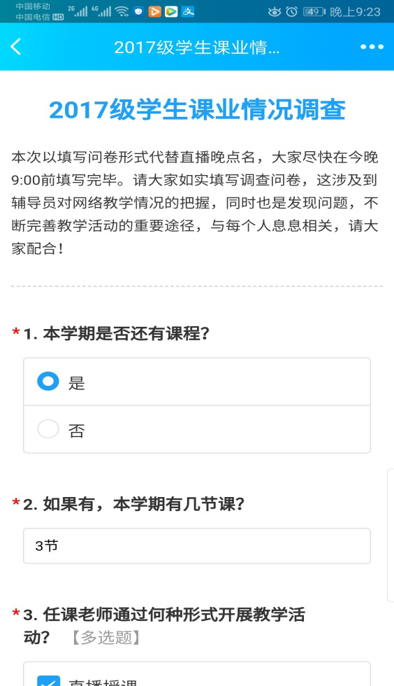 2017级采用问卷调查形式进行晚点名。辅导员张立波要求每位学生在规定的时间内在线填写《2017级学生课业情况调查》问卷。通过这次调查,辅导员全面了解了学生在线学习状况。本学期90%以上的同学仍有课程学习任务,对在线学习比较适应;在家学习效率较高的同学占41.74%,效率一般的占52.17%。学生也对在线教学提出了意见和建议,并希望辅导员继续提供有关法考、考研、就业等方面的指导,为提高进一步提高工作的针对性奠定了基础。