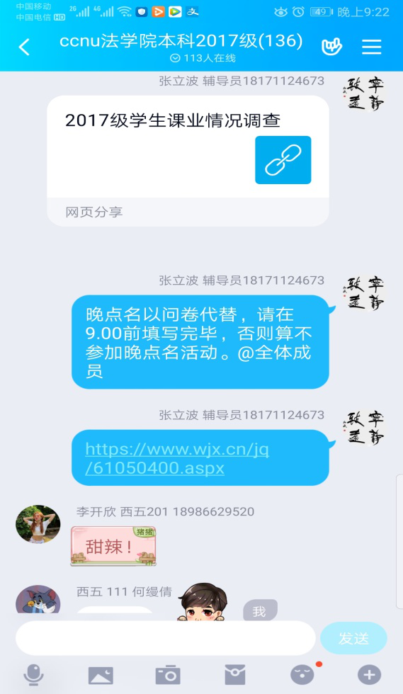 受新冠肺炎疫情影响,学校延迟了春季开学返校时间,“停课不停学”,学院师生按照原定开学时间,开始网上教学与指导。为全面了解学生在线学习情况和在家战疫情况,进一步指导同学们做好疫情防控、网络学习和毕业就业的相关工作,我院各年级本科生辅导员根据各年级的特点持续开展常规周末晚点名活动。2月29日的晚点名主要通过QQ直播、群接龙、线上问卷等形式开展。