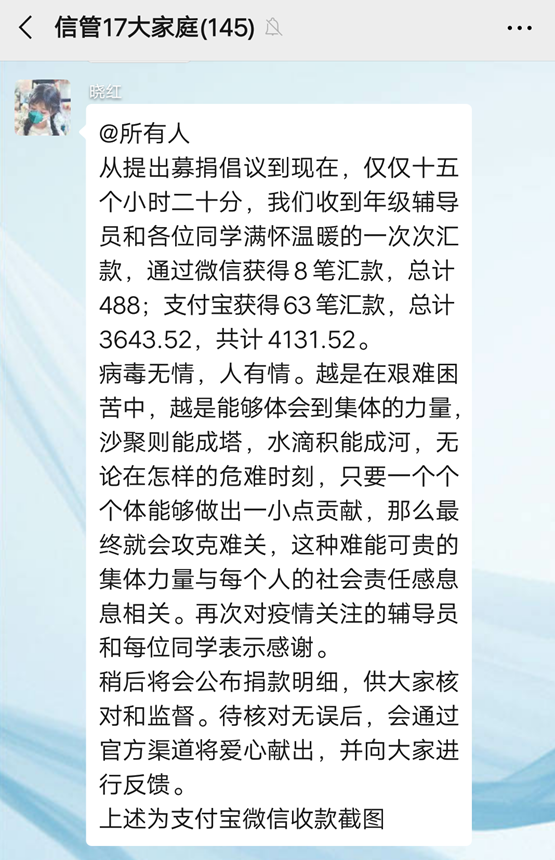 此次爱心募捐完全自愿,信息管理学院2017级全体成员用自己的实际行动积极为战斗在一线的“逆行者”家庭和因疫情致困家庭送去温暖,鼓劲加油,尽一份绵薄之力。