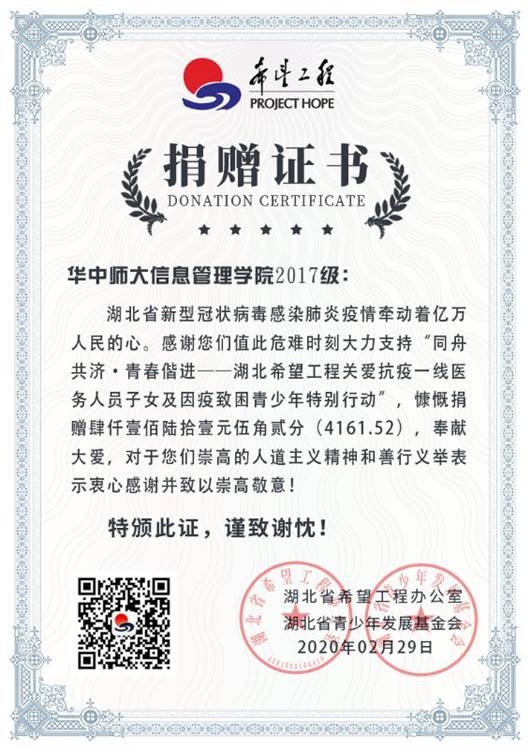 突如其来的疫情,牵动着信管学子的心。2月28日,华中师范大学信息管理学院2017级全体成员在辅导员蒋可鸣老师带领下自发为湖北希望工程“关爱抗疫一线医务人员子女”和“关爱因疫致困青少年”项目捐款。
