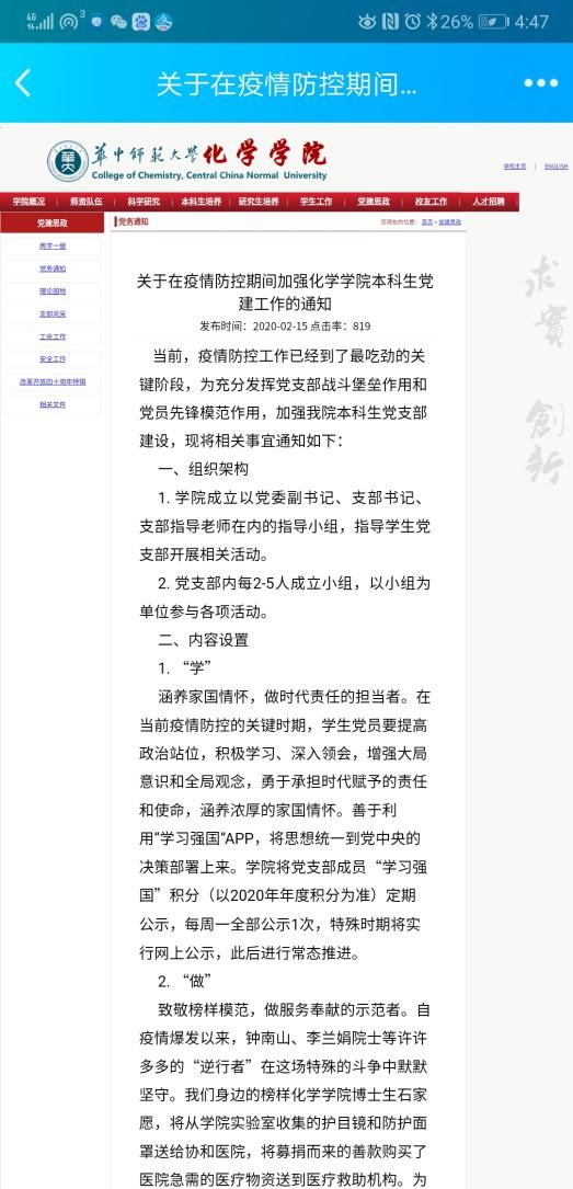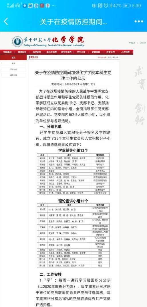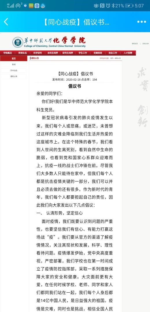 2月15日,学院成立包括党委副书记、支部书记、指导老师在内的指导小组,指导学生党支部抗疫活动;学生党支部内2-5人形成小组,开展“学”“做”“讲”系列活动。2月18日,本科生党员向全体同学发出倡议,号召大家认清形势、坚定信心;积极应对、传递能量;提升自我、担当使命。2月23日,党员组成团队做主题宣讲活动,涉及主题包括“科学防疫中的化学小知识”“疫情期间的中国好故事”“疫情期间网络谣言的鉴别与网络公德”“透过疫情对人与自然的思考”等,力求通过这样的方式,引导科学战“疫”。