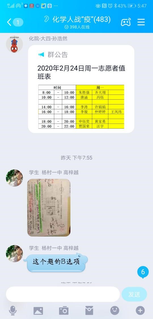 化学人战“疫”线上答疑群于2020年2月9日建立,旨在为初高中学生学习化学知识提供便捷的咨询通道。工作团队由15名学生骨干组成,通过制定群内管理细则、安排知识答疑值班和宣传科普知识,保障了群内环境的安全有序、问题答疑的全面覆盖及防疫知识的有效科普。截至2020年2月24日,群内人数达477人,其中学生累计334人,他们分别来自重庆八中、鄂南高中等162所学校。累计志愿者143人,包括答疑值班人数105人,其中2016级志愿者占有52人,当中有中共党员4人,中共预备党员13人,入党积极分子8人,共青团员25人,目前已开展了12期科普知识宣传。同时,志愿者们也调查收集了学生们的意见和感想,为进一步优化战疫群提供了宝贵的建议。