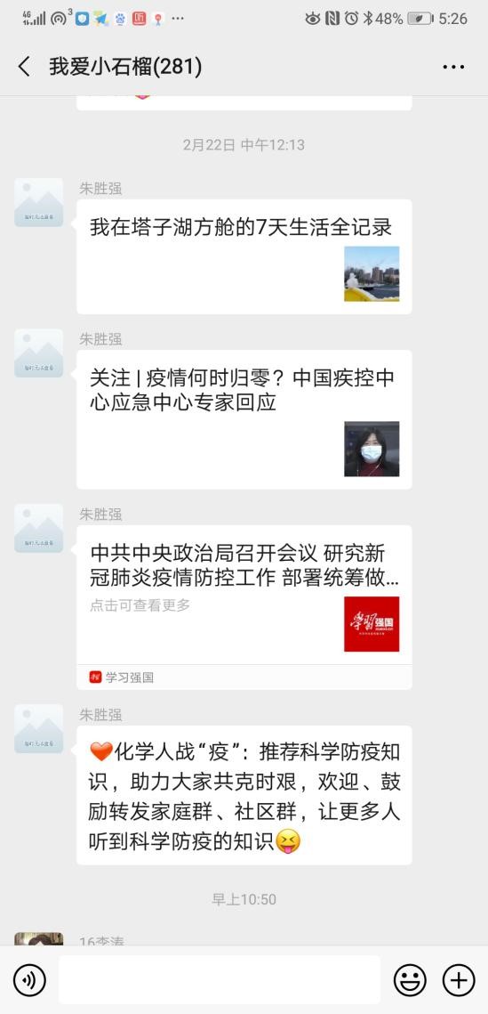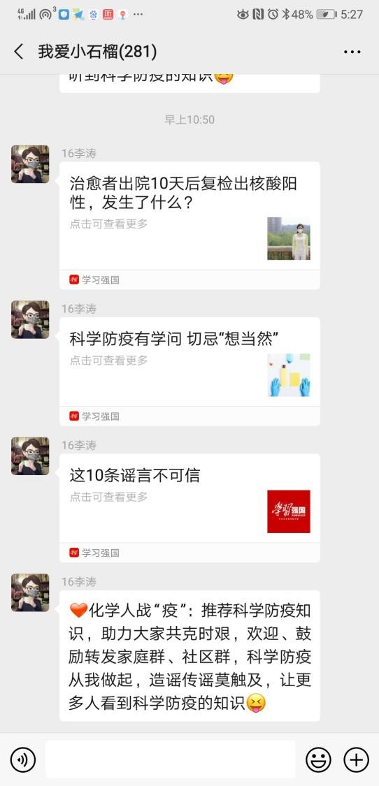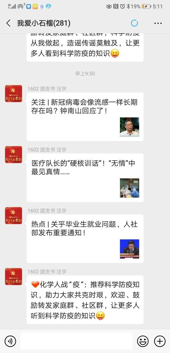 战疫期间,做好疫情防控的宣传教育和舆论引导工作,是强信心、暖人心、聚民心的重要环节,有利于凝聚众志成城抗疫情的强大正能量。为了给学生群众提供准确及时的新闻报道和科学有效的防疫知识,团队临时调整了“我爱小石榴”年级微信群的功能,安排大四学生骨干成立了科学防疫宣传小分队,在“学习强国”、“人民日报”公众号等权威平台上精心挑选宣传内容,发布到“我爱小石榴”微信群上以供大家阅读和学习。该小分队共6名成员,每天轮流值班,推送内容不仅有央媒发布的疫情相关政策新闻,还有与生活息息相关的科学防疫知识、抗疫一线的感人事迹以及各级各类的辟谣信息。