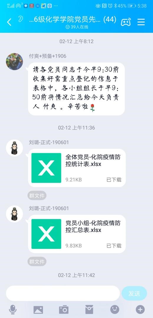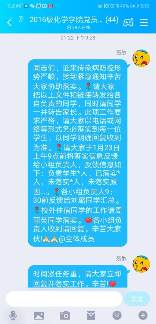 化学学院2016级本科生,共有39名中共党员,疫情发生后,党员同学主动请缨,按照党员同学对应服务群众同学的原则,将全体党员分为7组,并设立了7名小组长,一名大组长,负责宣传转发学院关于疫情防控的重要消息,将宣传落实到个人,确保每位同学及家长及时准确了解到学院关于疫情防控的相关动态。自1月24日起,为响应学校落实精准摸排和疫情“零报告”制度以及联防联控抗击疫情的号召,各党员每天耐心询问同学们的身体状况,将收集好的健康信息汇总给小组长,由大组长整理上报至辅导员。期间,通过党员自愿报名,又增设了11名大组长,轮班完成汇报任务。除关心健康状况,党员同志也热心关注同学们在学业、心理、生活、经济等方面的实际困难,为同学提供一对一的精准帮助和支持。