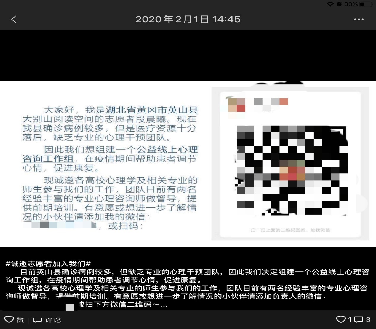 一是协同开展大众心理援助。针对广大师生和社会公众的紧张和焦虑情绪,心理学院迅速参与组建了一支心理援助支援服务队伍。研究生辅导员张婷身在外地,心系学校,通过各种途径面向在校生和校友发布招募通知,组织学生300余人参与心理援助,秉承以人为本、尊重生命、严谨专业、全力以赴的理念,传递爱心和信心。截至2月6日,共接待咨询近1500人次,该项工作被人民网、中国青年报等多家媒体报道。