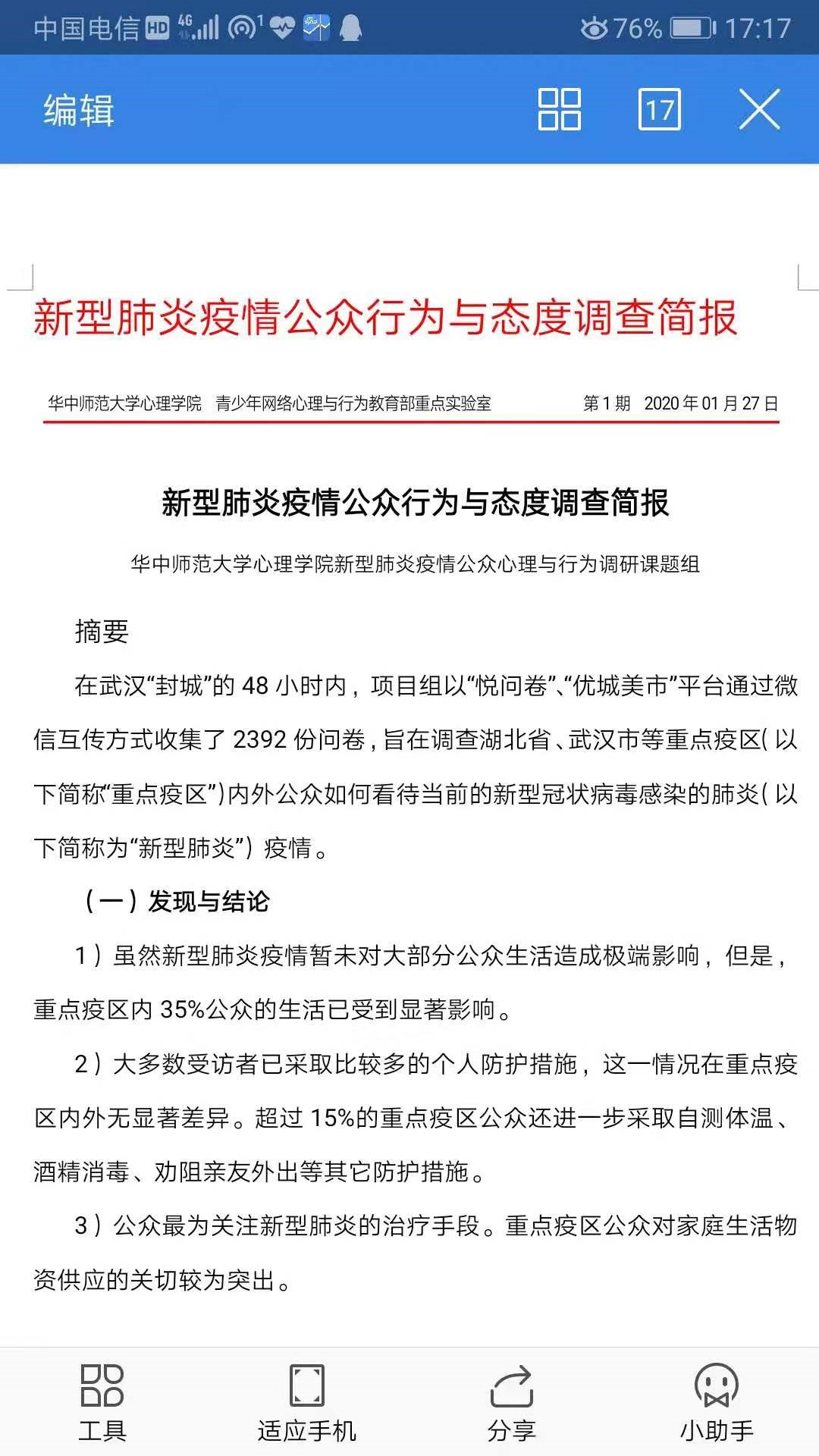 三是协同开展社会心理调研。发挥学院多年来施行的本科生导师制优势,在武汉交通管制的48小时内,组织本、硕、博学生上下联动,集体行动,参与调查湖北省、武汉市等重点疫区内外公众如何看待当前的新型冠状病毒感染的肺炎疫情。收集了约2400份文件,形成了《我们在武汉——新型肺炎疫情公众行为与态度调查简报(第1期)》。