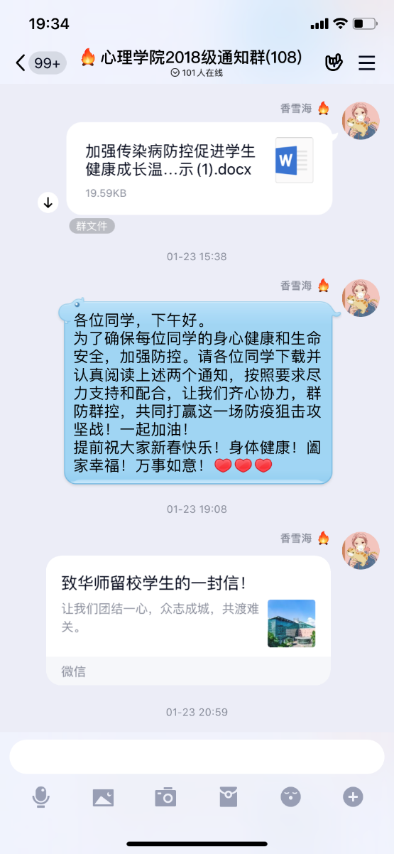 三是做好宣传教育,筑牢抗疫防线。学院采取措施开展疫情防控宣传,并充分利用微信公众号、QQ群等宣传载体,及时传达发布学校的决策部署,开展疫情防控知识、防范措施、注意事项、学院防控动态等宣传教育,引导学生正确认识疫情,消除恐慌情绪,动员家人注重防护,扎牢家庭防御线。截至目前,心理学院全体在读学生零感染、零疑似。