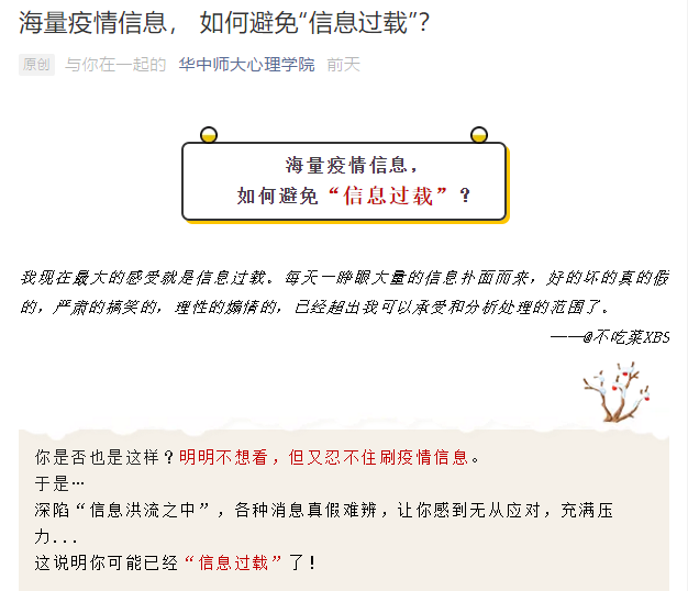 二是协同开展社会心态疏导。组织研究生参与公众心态短文撰写,面向不同人群开展心态疏导。针对网络学习迷茫者推出辅助教程《“庆余年”版的网课学习小助手来了!》、《网络课程来战“疫”,“宅家”学习有妙招》;针对高三学生推出调节建议《疫情下的升学恐慌——高三生应如何应对》;针对信息过载者推出科普短文《海量疫情信息,如何避免“信息过载”》;针对密切接触者推出情绪指南《怎么办?我曾经接触过新冠肺炎患者!》。