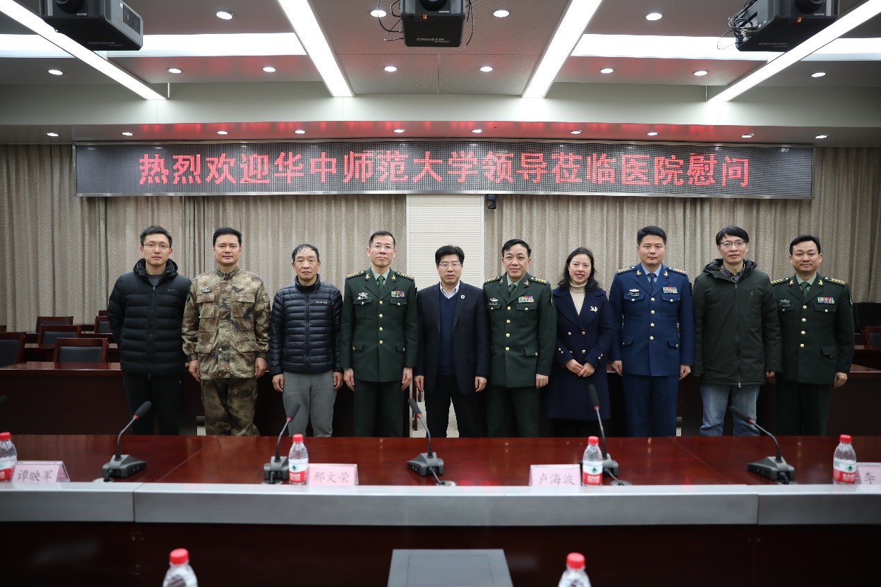 1月14日,副校长彭双阶、本科生院院长万坚、党委学生工作部(人民武装部)部长韩君华、副部长李刁等学校政工干部前往中国人民解放军空军预警学院及中国人民解放军中部战区总医院走访慰问。彭双阶代表学校向空军预警学院、中部战区总医院的全体师生、医护人员致以新春的真挚祝福和节日问候,并对空军预警学院几十年如一日对我校国防教育的支持与帮助表示衷心的感谢。在空军预警学院,副院长兼教育长谭贤四、教务处处长舒重胜及相关处室、大队负责人出席座谈会。2020年是空军预警学院承接华中师范大学军训工作的第21个年头,与会双方进行深入交流探讨,双方均表示,今后将进一步加强合作,深化共建关系,走军学融合发展之路,携手共进、共同发展“军地合作共建,军民有机融合”的合作局面。