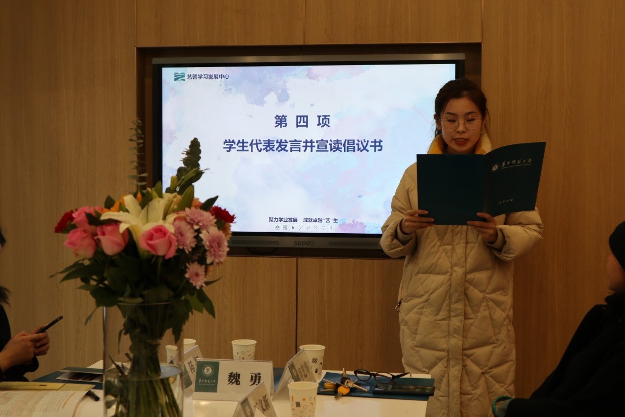 会议伊始,美术学院院长辛艺华致辞。她首先对出席会议的各位领导和老师表示诚挚欢迎和感谢。随后她提出,学习发展中心的成立对于人才培养质量提升有着至关重要的意义,学院将进一步整合资源、协同各方力量搭建好学习发展中心平台,提高学生对人才培养过程的认知,并将以此武装身心,为教师做好协助工作,为学生做好学业指导服务,推动学生学习与发展,让学生在交流、合作、探究式的学习中成长为富有激情的、能为未来做好准备的的综合型创新型艺术人才。