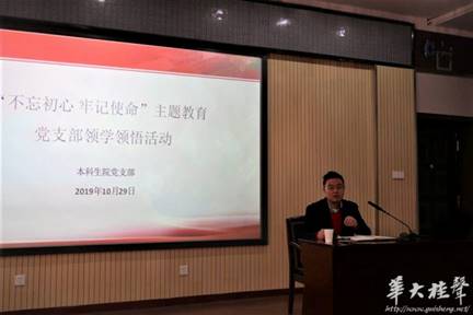 10月29日下午,本科生院党支部“不忘初心,牢记使命”主题教育活动专题党课在行政楼二楼会议室举行。支部书记韩君华为党员授课,副院长李刁、金新利和吴建成通过“领悟”环节分享学习体会。