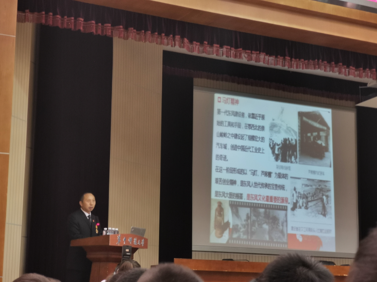 东风商用车有限公司车厂汽车装调工的全国劳模、高级技师王建清以奋斗的青春最美丽为主题,分享了自己一路走来的艰难困苦及人生经历,用东风文化最重要的源泉—“马灯精神”勉励同学“有梦想,就一定有希望!”