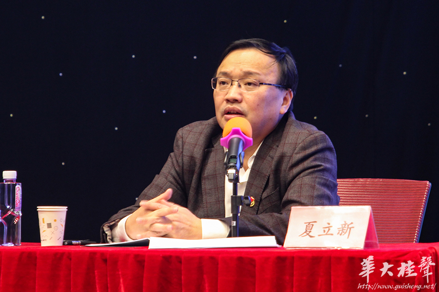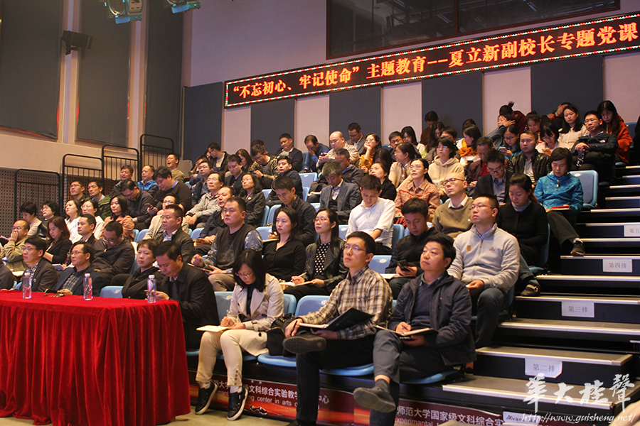 华大桂声讯 10月25日下午,夏立新副校长“不忘初心、牢记使命”主题教育专题党课在九号楼六楼演播厅展开。夏校长联系的本科生院党支部、研究生院党支部、教育信息技术学院分党委全体教工党员及部分学生党支部书记参加此次专题党课,党课由党委学生工作部部长韩君华主持。
