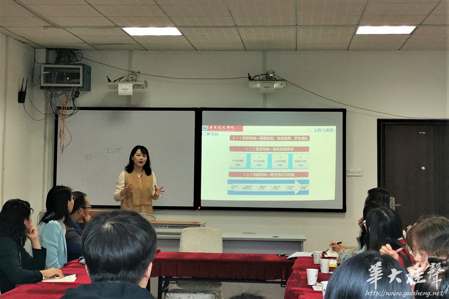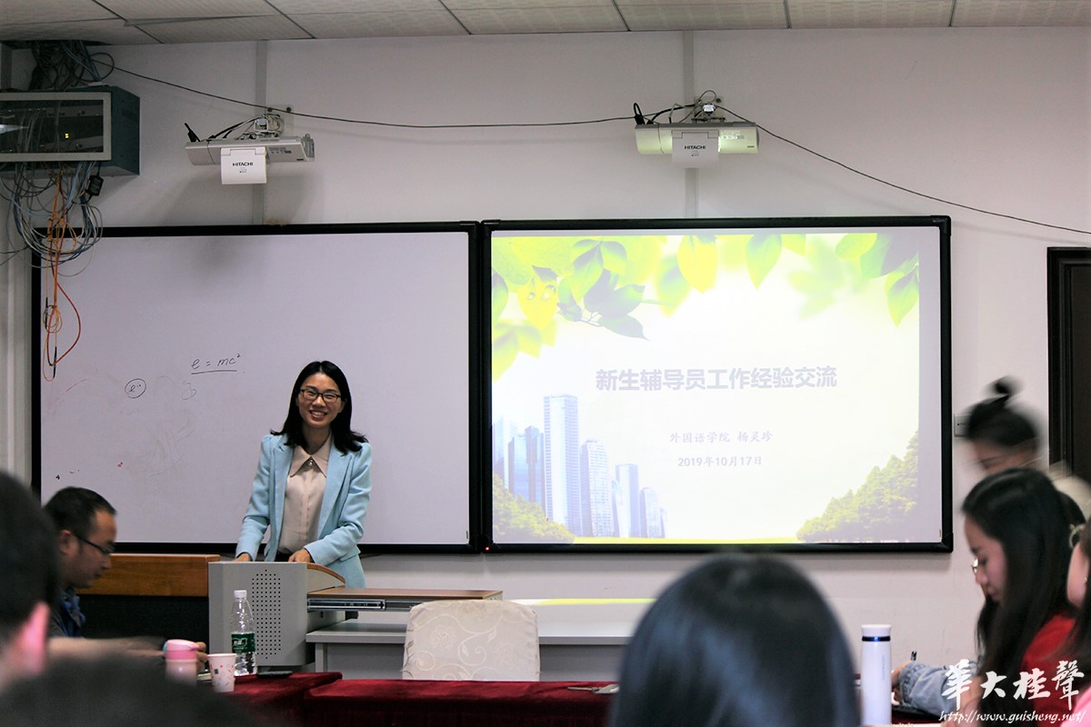 外国语学院副书记杨灵珍作为曾经长期工作在一线的政工干部分享了她的经验及感悟。她建议大家从最经典的三个跟辅导员联系最密切的文件出发,寻找自身的角色定位和工作方法。她强调,辅导员的角色定位不应仅仅停留在知心朋友,还应该努力将其上升到人生导师的高度。在之后的分享中,杨灵珍围绕“掌握大学生成长规律”、“思政规律与专业规律的互动结合”、“集体建设”等内容进行了深入的分享。