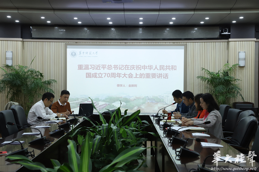 华大桂声讯 10月11日下午2:30,本科生院党支部“我和我的祖国”10月主题党日活动在行政楼一楼会议室展开。本次支部主题党日活动以 “五个一”为主要内容,通过齐唱一首红歌、重温一篇讲话、学习一张摘编、观看一集短片、分享一段感想的方式,加强爱国主义教育、弘扬爱国主义精神。本次活动由本科生院党支部书记韩君华主持。