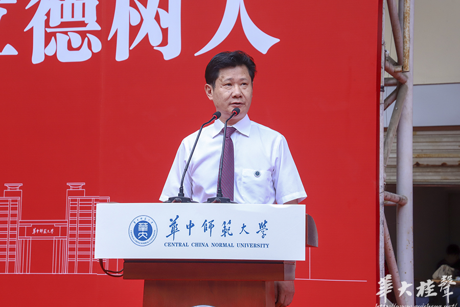 大会伊始,全体人员起立奏唱国歌行注目礼。礼毕,校长赵凌云对广大新生的到来表示热烈欢迎并致辞。在致辞中,赵凌云多次强调“爱国”这一关键词,他从这一本质要求出发,强调广大青年学生要“勇做新时代爱国青年”,要有旗帜鲜明的爱国立场、德才兼备的强国能力、敢于亮剑的报国行动,并将爱国落实到自爱、尊师与爱校的具体行动上。为此,他对新生提出了五点希望:一要坚守初心,珍惜过往;二要遵守校纪校规,珍惜学校声誉;三要敬畏师道尊严,守护师生互信;四要坚守人伦道德,常怀感恩之心;五要养成良好学习习惯,树立积极人生态度。赵凌云的致辞“金句”频出,他说到:“防止人工智能消解我们的智慧,防止算法粉碎我们的思想”,他要勉励新时代的同学们立志创新报国,努力为“中国梦”、“华师梦”贡献力量,在人生中最美好的“桂子山”时代圆梦。