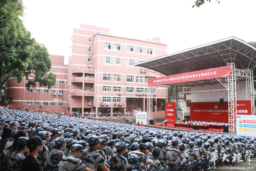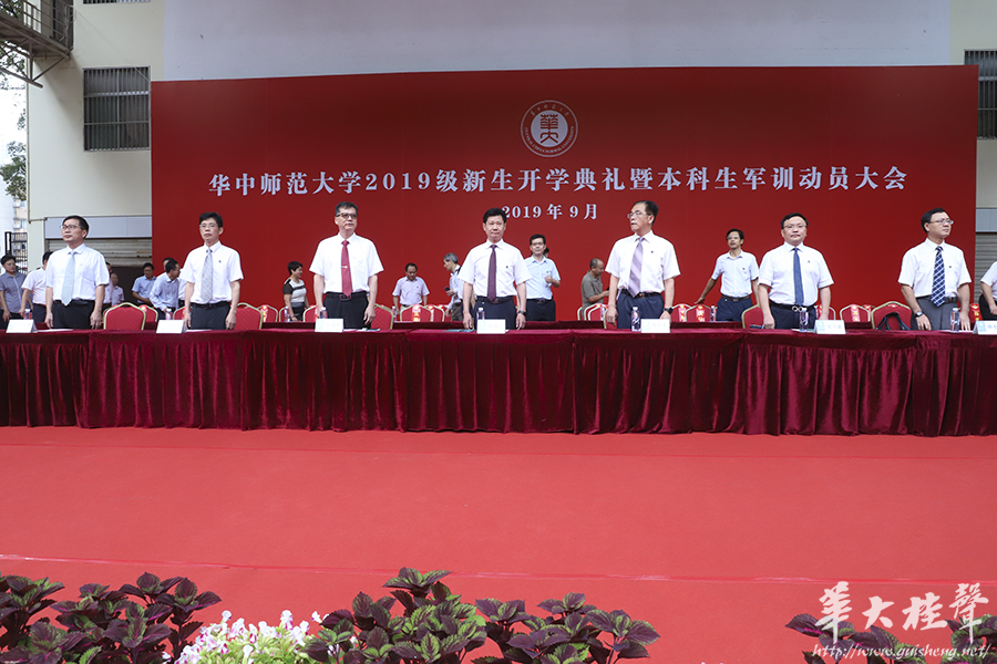 华大桂声讯 9月2日上午8时,华中师范大学2019级新生开学典礼暨军训动员大会在露天电影场隆重举行。党委副书记、校长赵凌云等学校领导,中国人民解放军空军预警学院第一大队二队队长、军训团团长刘天辉少校,空军预警学院全体承训官兵,以及我校各职能单位以及学院负责人出席大会。2019级全体新生和部分教师代表参加。典礼由副校长夏立新主持。
