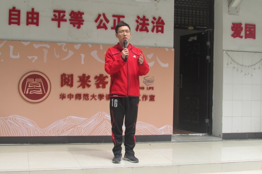 随后,学工部副部长李刁致辞。他作为见证阅来客栈发展壮大的一员,送来了祝贺。李部长表示,阅来客栈是华中师范大学的一张闪亮名片,它面向师生、社区,锻炼了广大青年的党性、提供了研讨学习的场所,播种下希望的种子。