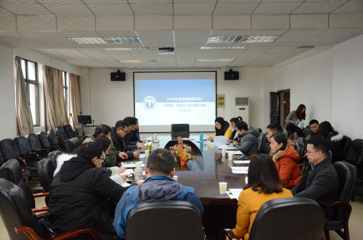 (通讯员 陈心雨 郭致怡)为深入贯彻党的十九大和全国高校思想政治工作会议精神,落实《华中师范大学关于加强和改进新形势下思想政治工作的实施意见》,进一步加强辅导员、班主任队伍建设,促进学生工作队伍素质能力提升建设,切实提升大学生思想政治工作质量,1月8日上午,信息管理学院在9号楼918会议室举行2018年度辅导员,班主任汇报交流会.参加本次会议的领导有信息管理学院党委书记汪继平,院长李玉海,副院长卢新元,全体班主任及本科研究生专兼职辅导员。会议由院团委书记蒋可鸣主持。