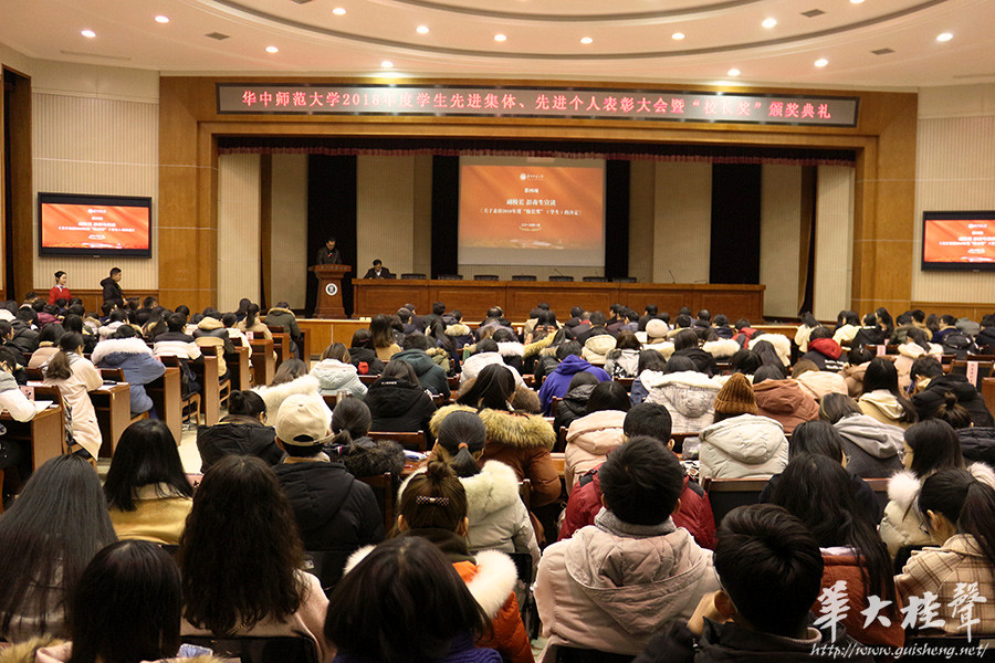校党委书记黄晓玫在讲话中表示,2018年我校紧紧围绕“建设高水平大学”的办学目标和“立德树人”根本任务,不断提高教学质量,增强育人能力,学校党建及思想政治教育全面深化、人才培养质量稳步提升、师生先进典型不断涌现。她向华师学子提出三点希望:一是学好榜样,找准方向。不忘求学初心,以先进为榜样,找准人生奋斗方向,向榜样学习成功之法、为人处世之道。二是认清形势,励志成才。要认清世界和中国发展大势、国家经济社会发展对未来人才素质能力发展的要求,求得真学问、练好真本领。三是笃志前行,勇于实践。作为新时代的新青年,同学们应该“爱国、励志、求真、力行”,努力成长为有理想、有学问、有才干的实干家,成为德智体美劳全面发展的社会主义建设者和接班人,为全面建成小康社会、全面建设社会主义现代化强国而努力奋斗,实现中华民族伟大复兴的中国梦。