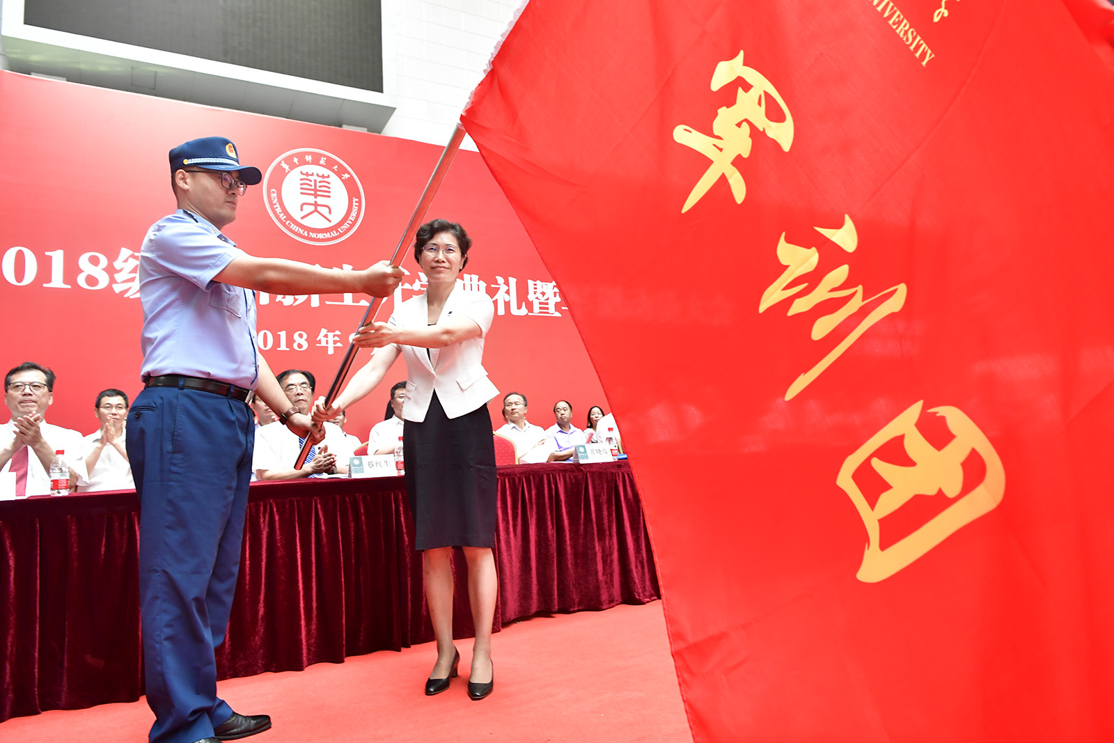 典礼上,副校长蔡红生宣读《关于2018级新生军训及军训团干部任职的命令》,校党委书记黄晓玫为军训团授旗。
