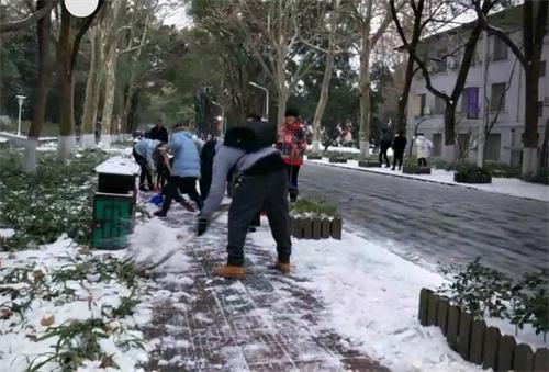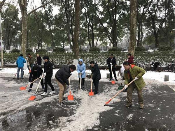 志愿者们冲在了清扫积雪的第一线,他们分成若干小分队,由学院副书记或辅导员带队,前往元宝山学生社区、东区学生社区、桂中路、西区学生社区、国际文化交流园区等地方开展道路除雪活动。在我校南湖校区,体育学院分党委副书记胡国良亲自带队清扫主干道积雪。银装素裹的桂子山上,随处可见志愿者们忙碌的身影,志愿者们用感人的行动给广大师生带来了浓浓暖意。