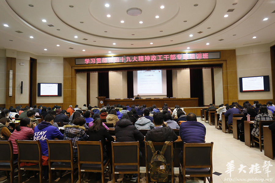 华大桂声讯 12月6日下午2点30分,华中师范大学“学习贯彻党的十九大精神政工干部培训班”第四期培训在科学会堂一楼报告厅成功举行。本次培训由华中师范大学党委副书记、学习贯彻党的十九大精神宣讲团成员覃红教授主讲,我校学工部、研究生院,学生就业工作处、校团委全体职员,学院全体副书记及辅导员参加了培训,报告会由学工部部长刘宏达主持。