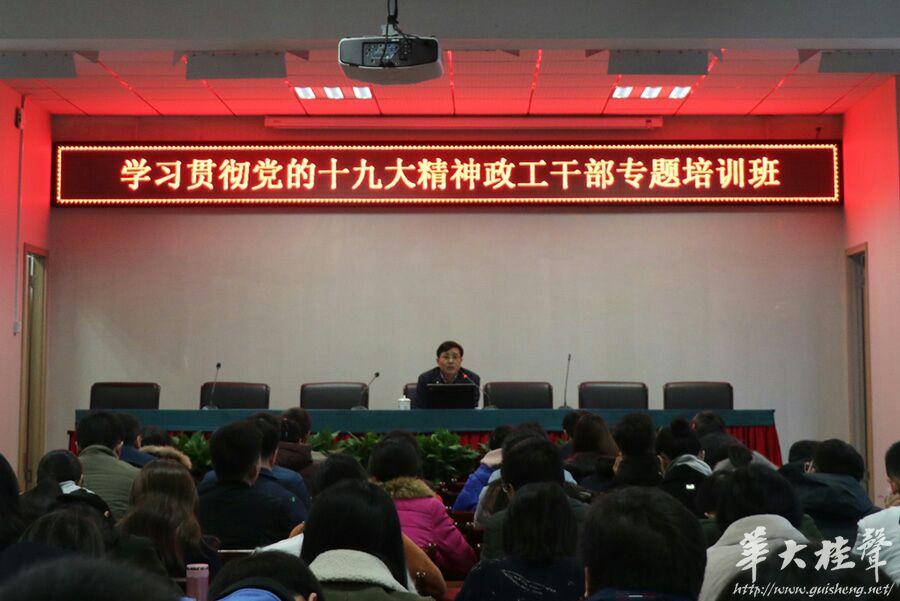 华大桂声讯 11月30日下午,华中师范大学“学习和贯彻党的十九大精神政工干部培训班”第三讲在大学生活动中心403成功召开。本次培训讲座的主讲人是华中师范大学学工部部长刘宏达教授,参加本次培训的有各学院副书记、全体本科生专兼职辅导员和来自中南干部班的河南省部分高校的中青年干部成员。