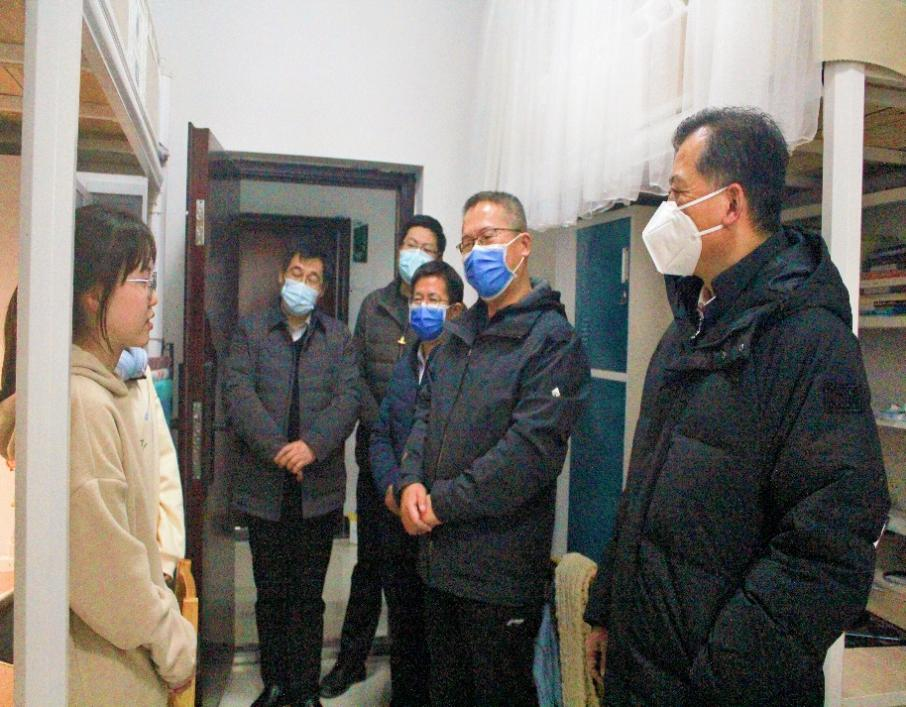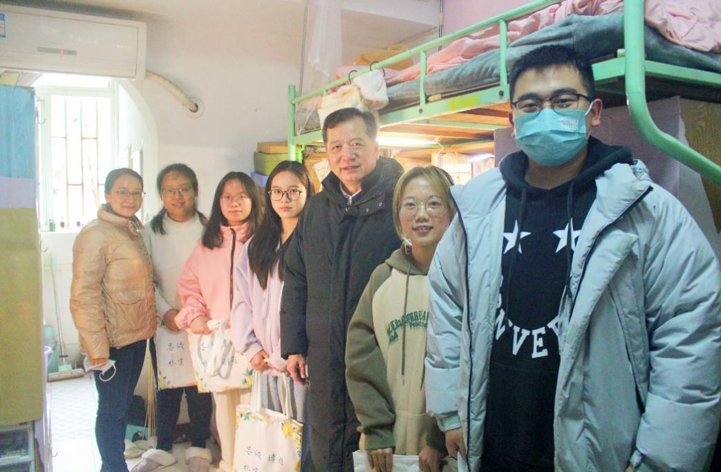 在元宝山一栋宿舍,彭校长和几位研究生进行交谈,询问他们的选题情况及本科院校,并给予同学们鼓励,希望他们在寒假期间谨慎思考,认真选题,积极与导师沟通,交流各种问题,最后祝愿他们在学业方面有所成就。