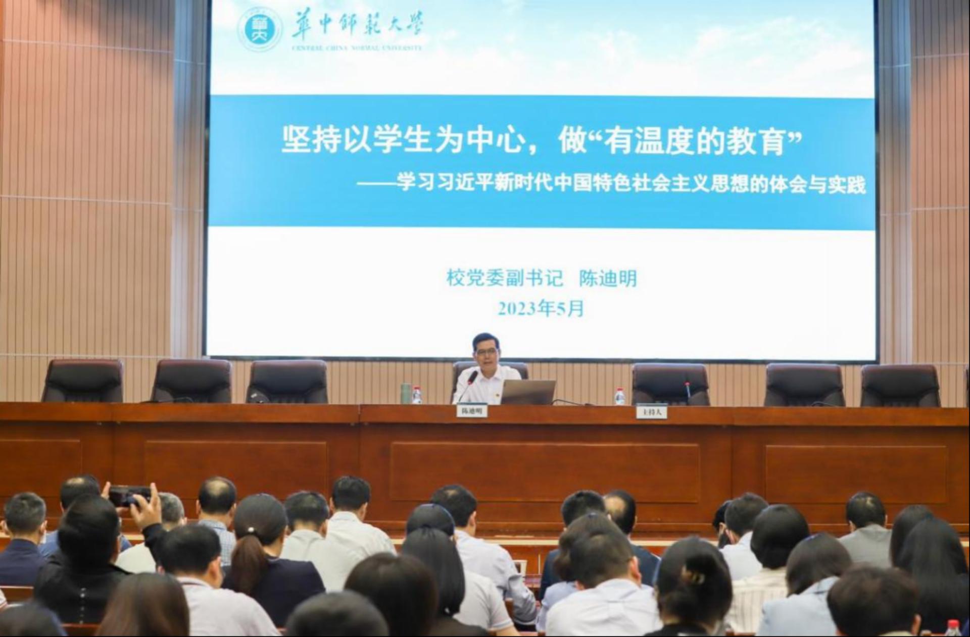 陈迪明从三个方面报告了习近平新时代中国特色社会主义思想的学习体会,在“原原本本学原文、认认真真悟原理”的理论学习中,学深悟透新时代贯彻落实立德树人根本任务的新要求;在“扑下身子察实情、沉到一线接地气”的调查研究中,学深悟透新时代以人民为中心的新要求;在“有温度的学生工作、有高度的人才培养”的发展实践中,学深悟透新时代办人民满意教育的新要求。坚持以学生为中心,做有温度的教育,是贯彻落实习近平新时代中国特色社会主义思想,在高校思想政治教育进行的实践探索。