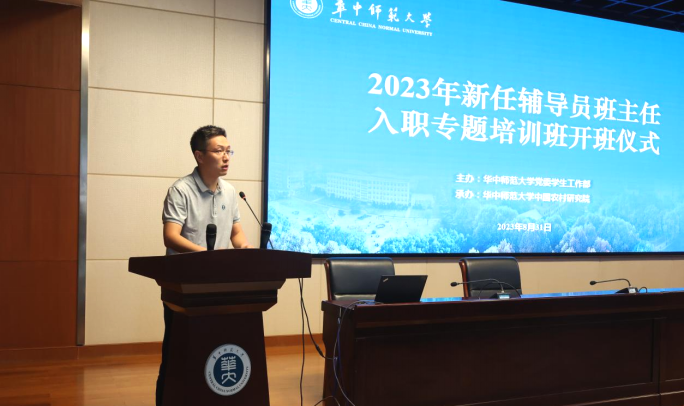 8月31日,由党委学工部主办、中国农村研究院承办的学校2023年新任辅导员班主任入职专题培训班在管理教育综合楼一楼报告厅举行。全校新入职的45名专兼职辅导员和75名班主任参加培训。校党委副书记、党委学工部部长陈迪明,党委学工部思政处负责人出席开班仪式,开班仪式由党委学工部副部长、思政处处长李刁主持。
