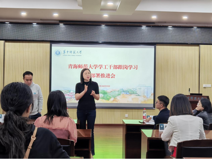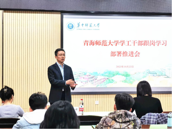 (通讯员 许亨洪)10月23日上午九点,青海师范大学学工队伍跟岗学习部署推进会在行政楼二楼会议室举行,华中师范大学党委学工部思政处处长李刁、副处长李宪玲出席,青海师范大学3名党委学工部职员、12名辅导员以及华中师范大学党委学工部相关科室老师、对接学院13名辅导员参加会议。
