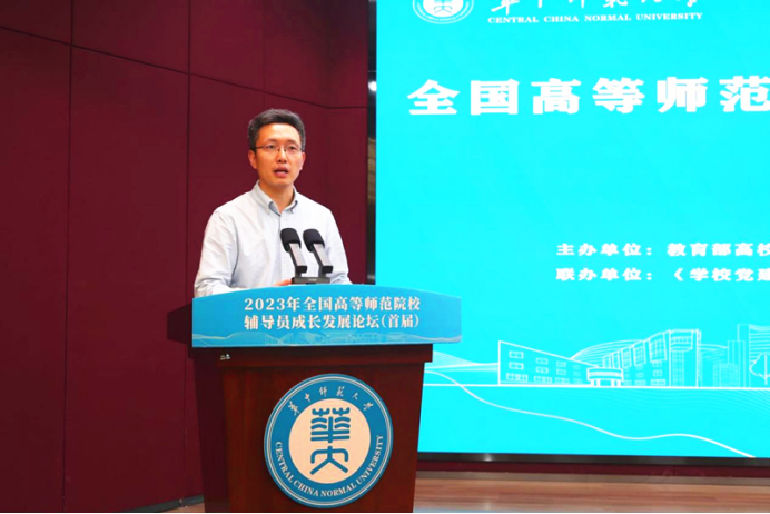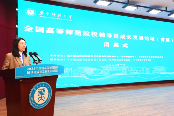 随后,参会代表、东北师范大学辅导员张婧宁发言。她代表全体参会人员对精心筹备本次论坛的华中师范大学和《学校党建与思想教育》杂志社表示了感谢,并用三个关键词表达了本次论坛学习收获:一是“赋能”。本次论坛邀请了曾荣获全国最美高校辅导员、全国高校辅导员年度人物等重大荣誉的资深辅导员从素质能力提升、职业成长发展、创新实践探索等方面,专题分享了教育智慧与成长发展经验,为参会辅导员开拓工作视野、提升育人本领、发展综合素质进行了全方位赋能,全体参会人员均表示启发很大、收获颇丰,对辅导员职业充满了无比的信心与希望。二是“温暖”。华中师范大学对论坛进行了精心的策划和筹备,邀请了教育部思政司领导现场指导,联合《学校党建与思想教育》杂志社提供了学术支持,为辅导员老师们安排了团队破冰、专题报告、分组研讨、集中交流、参观学习等丰富学习内容,并提供了高水平的精细化服务,让参会人员倍感幸福与充实,更加体会到了华中师范大学“有温度的教育”品牌的特色与魅力。三是“前行”。历经近三天的集中学习,全体参会人员不仅提升了思想认识、政治觉悟与素质能力,更坚定了长期从事辅导员职业的信心和决心,今后将以成为“最美辅导员”为目标,努力提升内在本领,潜心立德树人,扎实躬耕思想政治教育这份“责任田”,以高水平思想政治教育助力大学生德智体美劳全面发展。