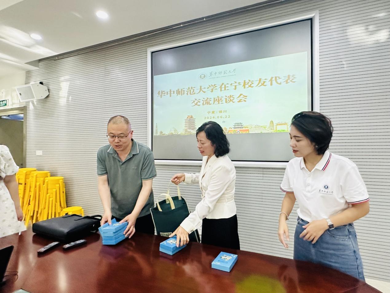 在银川期间,韩君华一行联络宁夏校友会,与校友们进行了座谈交流,并向校友送出精美的母校周边文创。座谈会上,韩君华向校友们介绍了学校近年来的发展情况和取得的成就,对宁夏校友会、校友们长期以来对母校的关心和支持表示感谢。校友们畅所欲言,就自己在校期间的收获、毕业之后的发展情况进行交流,并围绕母校学生培养、搭建校友合作平台、提供职后专业发展培训等方面提出宝贵意见。校友们纷纷表示,将继续关注和支持母校的发展,在自己的工作岗位上为母校贡献自己的力量。