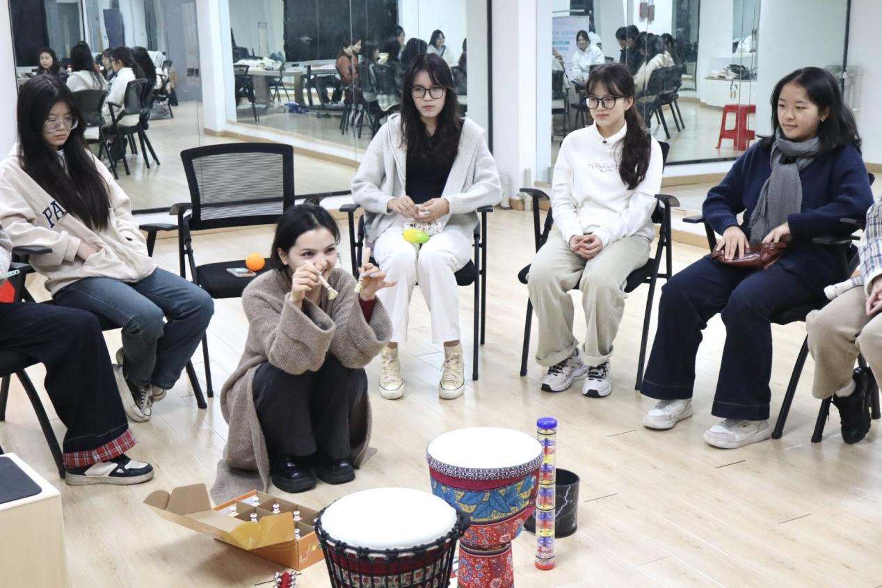 音愈心灵,辅启新章。安凯尔进行总结,他向蒋可鸣表达了诚挚的感谢,同时叮嘱同学们发现自己,悦纳自己,善于倾听自己的声音,选择热爱的方式应对不同情绪,迎接生活的每一天。本次活动在乐器大合奏中圆满结束,音乐疗愈,以其温馨的方式传递了关心和爱。无论是游戏互动,还是乐器奏鸣,都让大家在忙碌的生活中找到一片宁静的港湾。