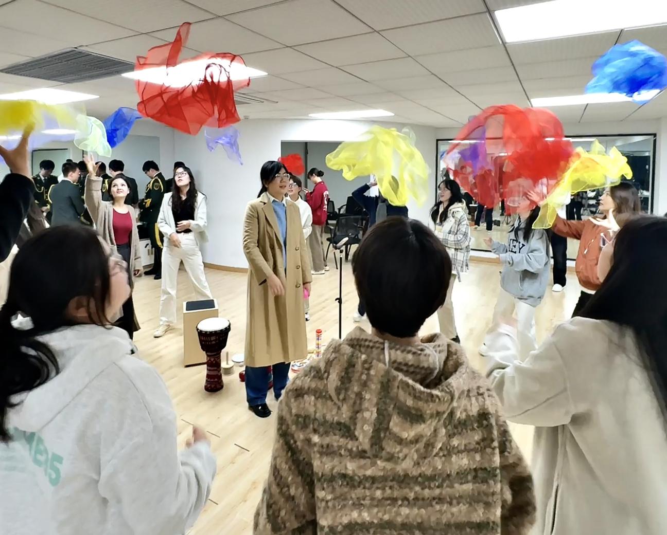 “这世界有那么多人,多幸运,我有个我们。”在乐器伴奏中,蒋可鸣以一曲“这世界有那么多人”开场,同学们不约而同的轻唱附和,在轻松活泼的氛围中拉开了活动的序幕。大家在音乐中寻找属于自己的节拍,确定代表心情的专属乐器,并通过沙蛋乐器的传递游戏认识了彼此。