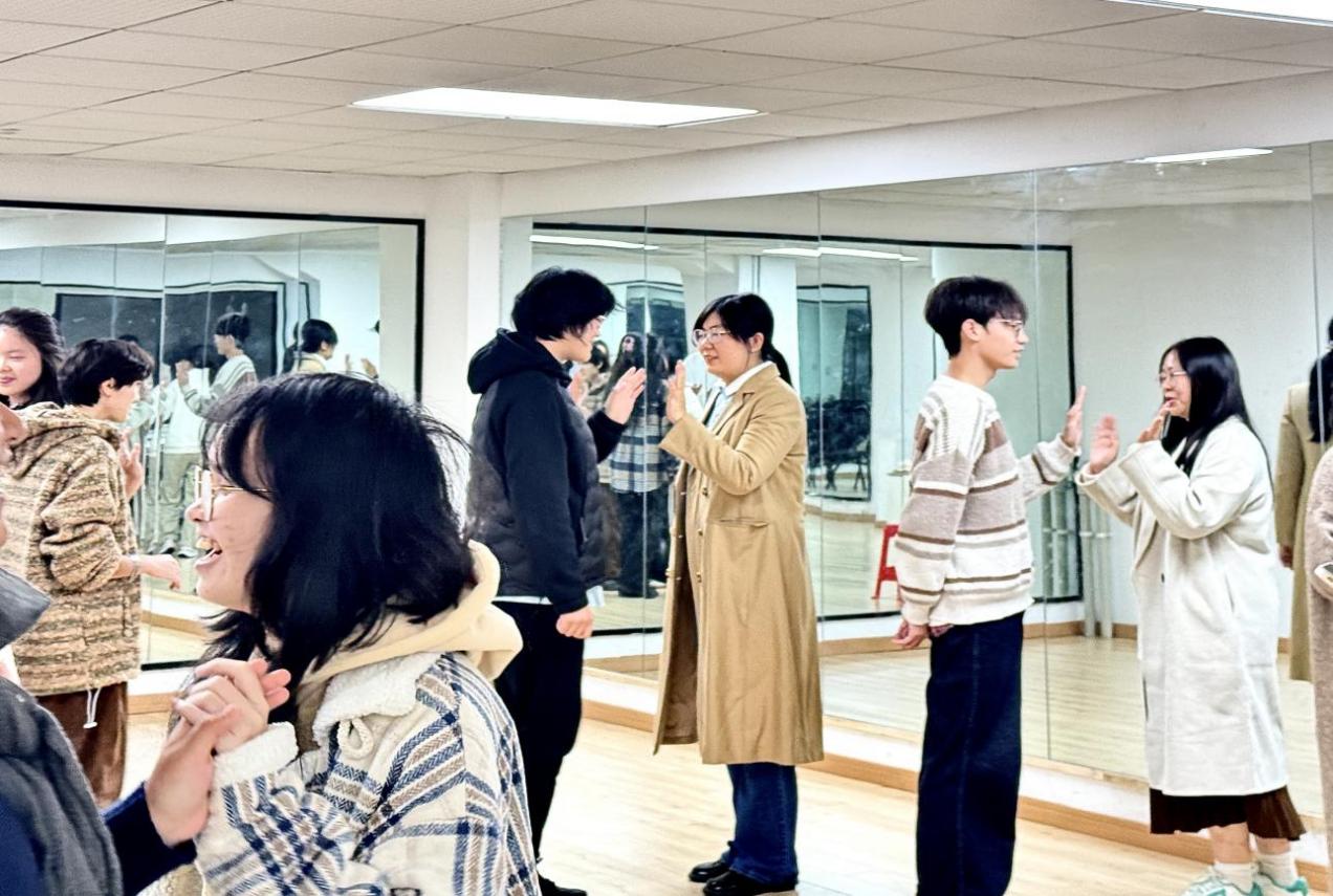 疗愈旋律,温暖人心。在各自俏皮的展示中,大家很快熟悉了彼此。在蒋可鸣的引导下,同学们围圈而立,开始随着音乐的节拍摆动身体,拍手、转圈,在音乐中感受这种自由与放松。随后又进行了难度升级,在音乐的间奏时与自己的新伙伴打招呼,共享欢乐,气氛愉悦。
