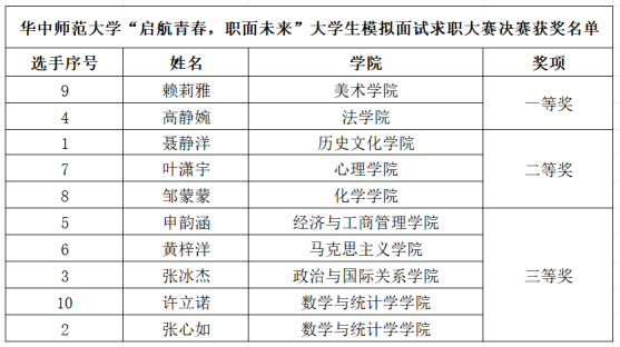 至此,华中师范大学“启航青春,职面未来”大学生模拟面试求职大赛决赛圆满落幕。下一步学校将陆续开展包括第二届全国大学生职业规划大赛在内的各项就业技能提升活动,坚持“以赛促教、以赛促学、以赛促创”的理念,引导广大青年学生树立正确的成才观、就业观,为提高学生全面发展奠定坚实基础!