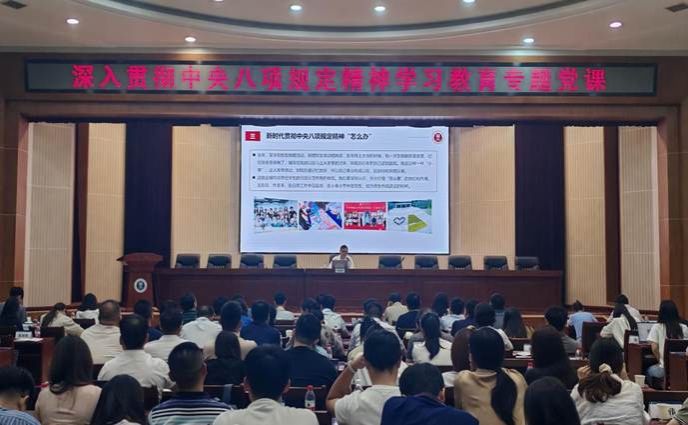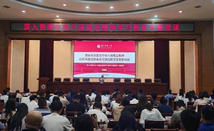 华大桂声讯 6月23日,学工战线深入贯彻中央八项规定精神学习教育专题党课(思政课)在科学会堂一楼报告厅举行。校党委副书记陈迪明围绕“锲而不舍落实中央八项规定精神,以作风建设新成效开创高质量发展新局面”这一主题,为学校全体政工干部讲授专题党课。党委学生工作部、校团委、就业工作处全体人员及各培养单位分管学生工作负责人、全体本研专兼职辅导员、学生代表参加党课学习。专题党课由党委学生工作部副部长杨军主持。