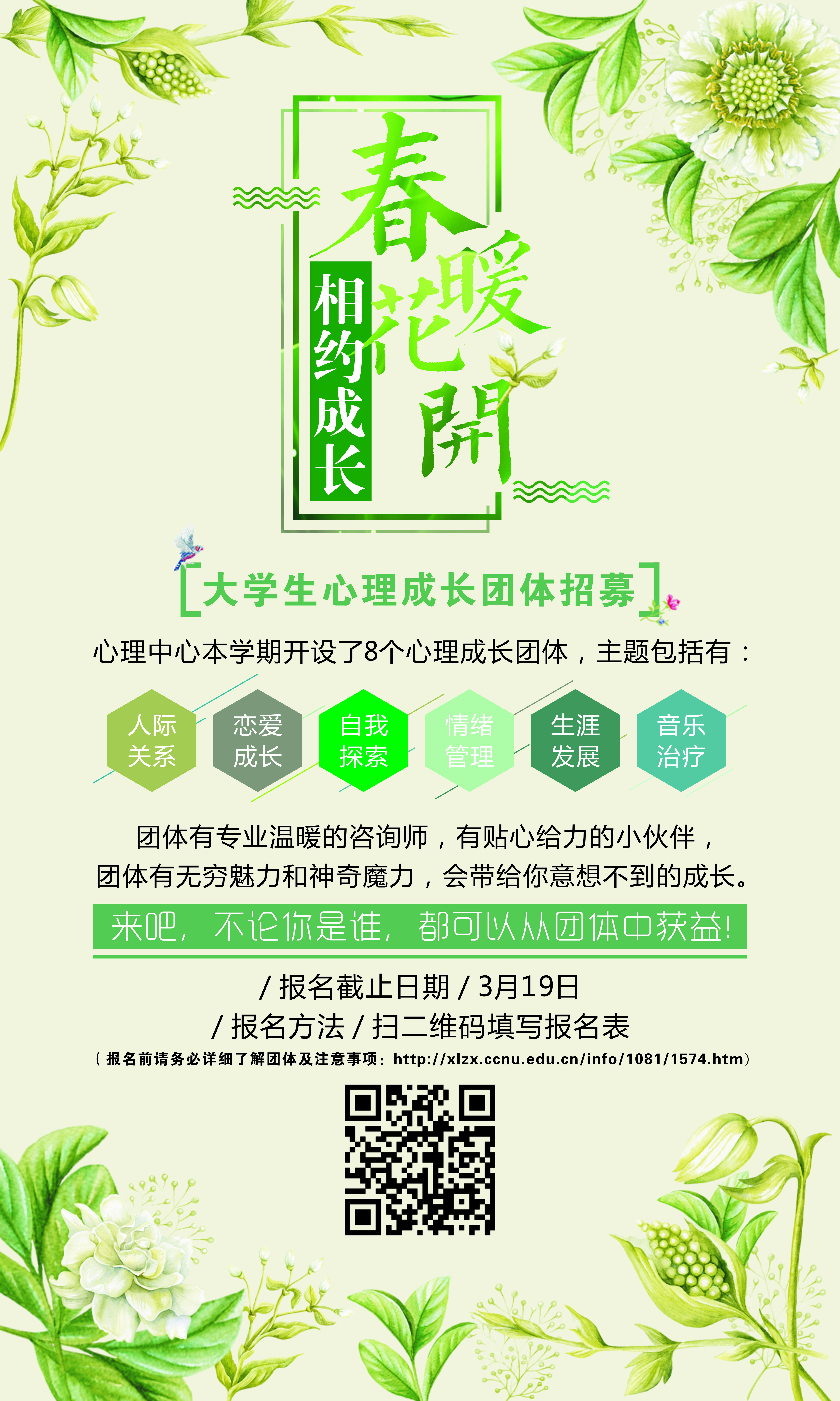 现面向本校全日制在读学生招募成员,报名截止日期3月19日。欢迎有兴趣和需要的同学进入招募公告链接http://xlzx.ccnu.edu.cn/info/1081/1574.htm了解团体详情及报名方式,积极报名。
