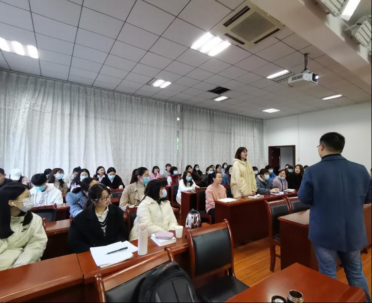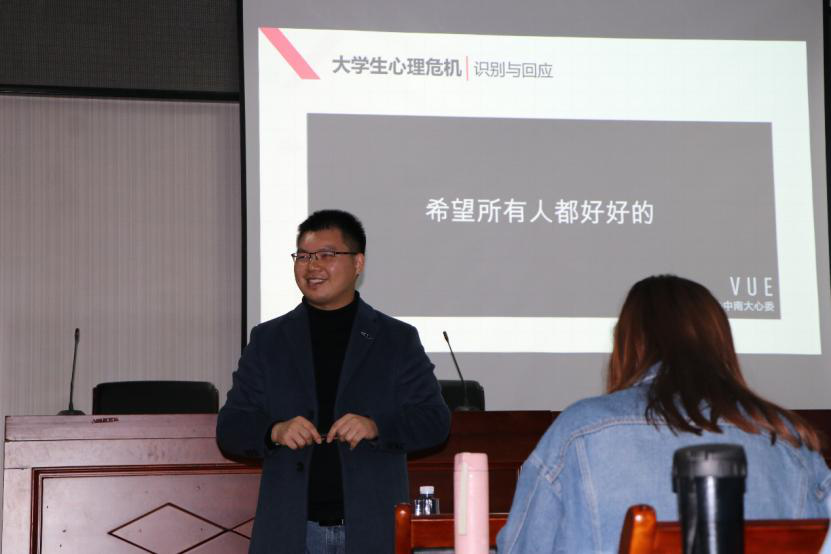 正式开始前,余老师发起一个小游戏,全体人员站立,左手开掌朝下,右手伸出食指,放在身边人的左手掌下,待发起人说“3”时,左手可握住旁人的右手食指,看能否抓住。在游戏互动中,现场氛围活跃。接着,余老师以一组大学生心理危机的最新数据调查引入,强调关注大学生生命健康与身心健康的重要意义。他结合工作实际与经验,围绕官方公布的真实案例与视频,从“自杀行为的识别与回应”“抑郁症的识别”“校园危机救助流程”三个方面,详细分析了大学生所面临的心理危机及预防措施。期间,余老师针对一些类似危机情况如何处理等问题提问,同学们积极参与,表达自己的观点。