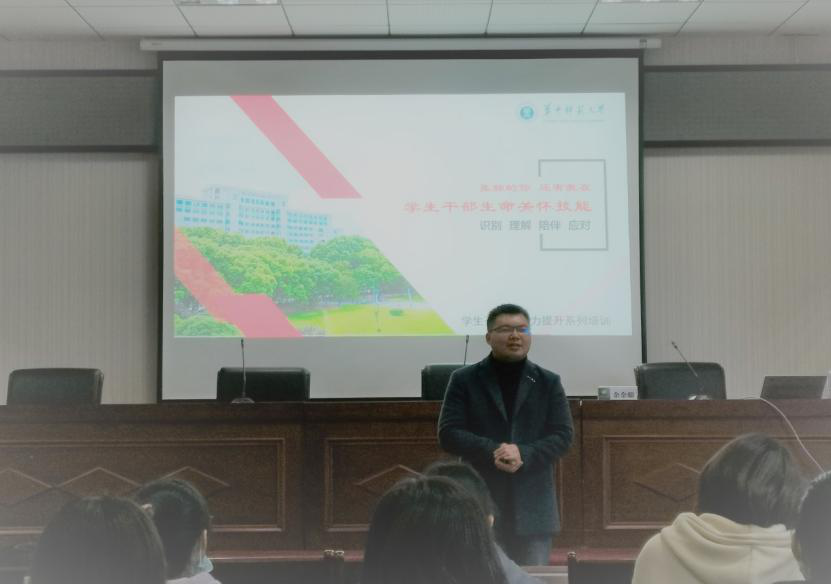 余老师指出,大学生在遇到重大问题而使个体感到难以解决、难以把握时,内心的平衡会被打破,内心的紧张也会不断积蓄,继而出现无所适从甚至思维和行动的紊乱,即进入一种失衡状态,也就是心理危机状态。学生干部在校园危机救助流程中发挥着不可忽视的作用。面对这种情况,学生干部首先要保持冷静,学会识别与回应,学会运用自己的共情,在互动过程中用心倾听,设身处地的站在对方的角度去感受和安抚对方情绪。同时应告知辅导员、导师和心理中心老师,及时寻求学校心理健康中心、校医院心理门诊等专业力量帮助,更好地帮助同学度过危机。此外,余老师还详细介绍了我校心理健康中心、校医院心理门诊,校外专业医院等资源。