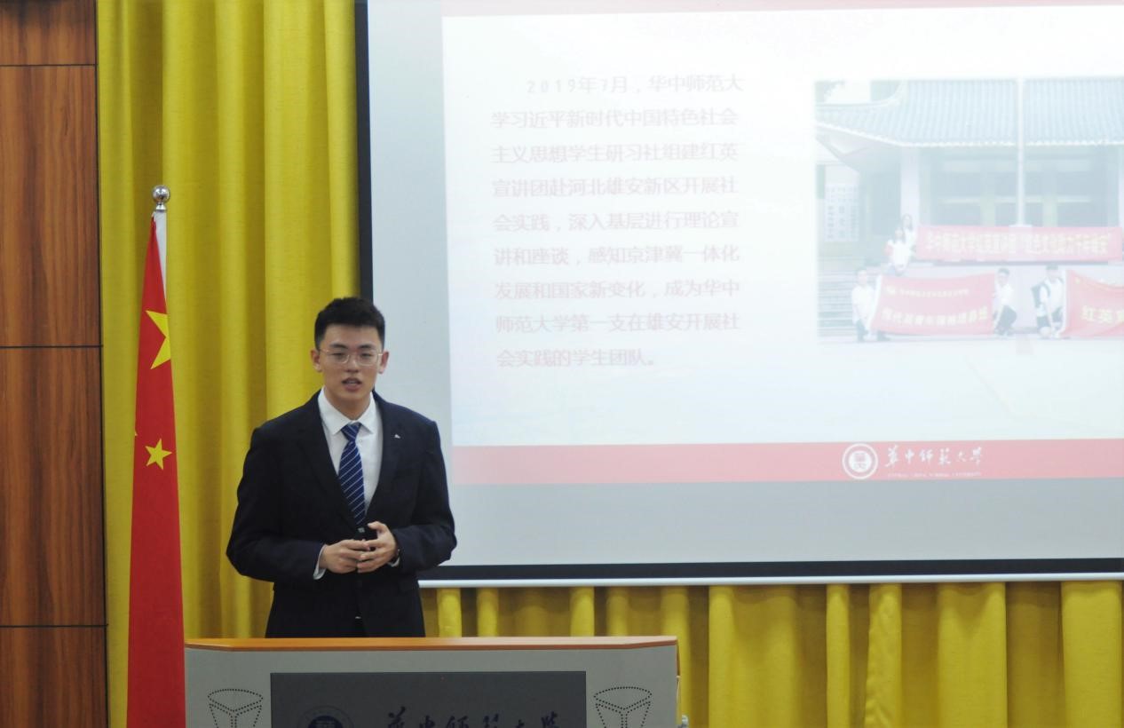 本次汇报分为展示与答辩两个环节。首先展示实践成果的是红英宣讲团,答辩人王晨以“擦亮信仰,与祖国同行”为题,讲述团队在雄安的社会实践过程中通过组织座谈等形式,取得了丰硕的实践成果。王晨表示,“实践中最大的收获就是真切地感受到了村民的淳朴。