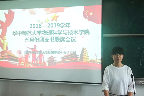 5月21日中午,物理科学与技术学院五月团支书联席会议在九号楼十二楼报告厅顺利召开,物理学院第一团副鲍从发、第二团副雷钰涵、组织部长赵美鑫及16、17、18级团支书出席本次会议,组织部部委李爽担任本次会议主持。