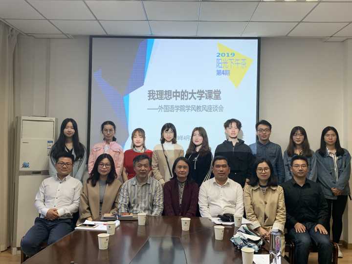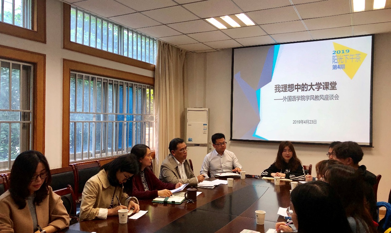 4月23日下午,外国语学院阳光下午茶第四期——“我理想中的大学课堂”教风学风座谈会在3号楼北楼234会议室成功举办。外国语学院副院长高晓芳教授主持会议,各系教师代表受邀担任本期活动的嘉宾。