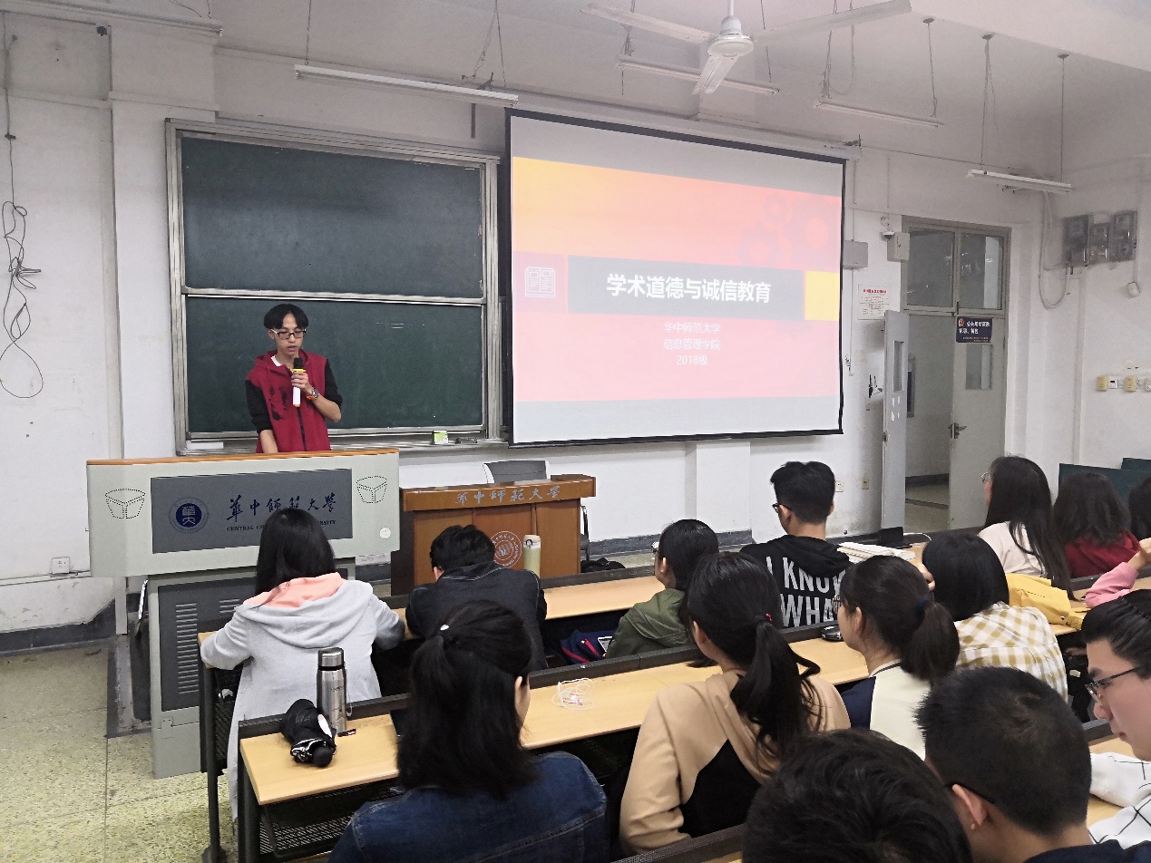 4月21日晚5:00,信息管理学院18级本科生晚点名在8号楼8210教室进行,期间开展了以“学术规范和诚信教育”为主题的活动,包括《大学生法律实务》思政主题教育课程、“明德小导师”宣讲、诚信与学术道德规范教育等内容。