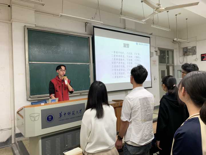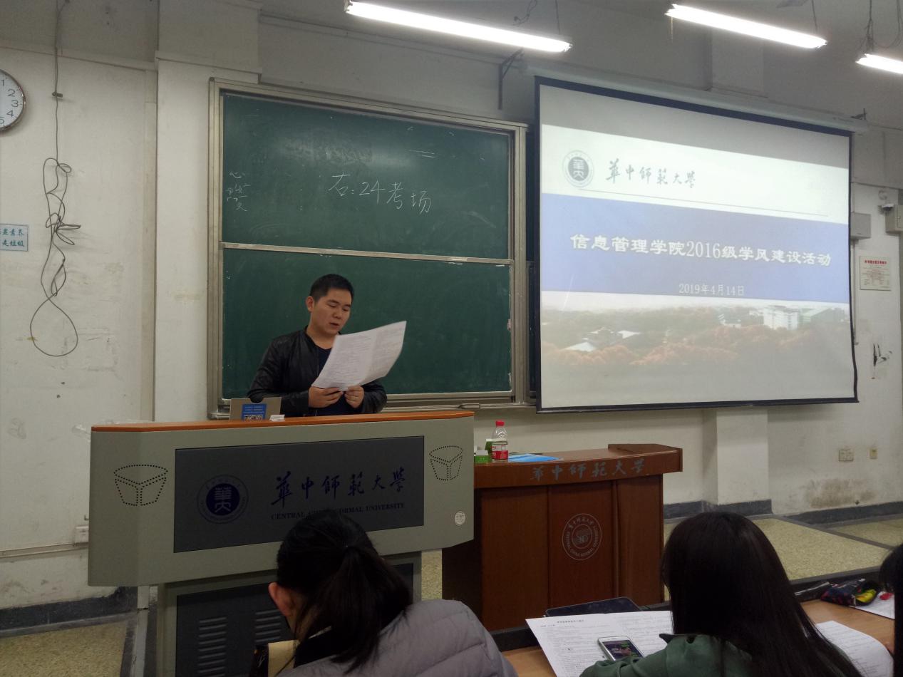4月14日晚,信息管理学院18、17、16级本科生晚点名依次在8号楼8210教室进行,期间开展了一系列的以“胸怀责任,发奋读书”为主题的学风建设活动,即学习学风建设倡议书、学习学校规章制度、“明德小导师”学业宣讲等内容。