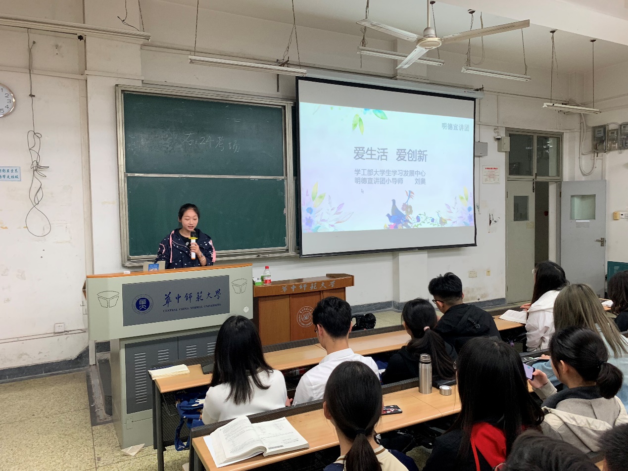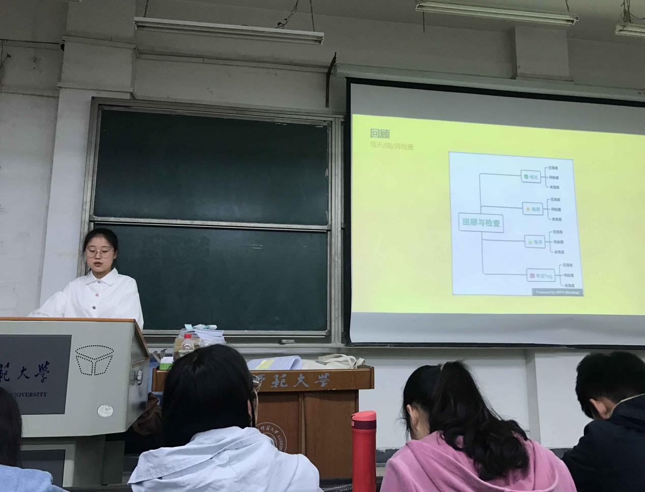紧接着第二项进行了“明德小导师”学业宣讲,本次宣讲的是2018级刘奥和2017级陈茗两位同学。刘奥同学以“爱生活,爱创新”为主题,以小短片形式向同学们介绍了垃圾自动收集系统的设计灵感和工作原理,同时还特别介绍了一些有趣实用的创新产品,如模拟胶片机app、震动瞌睡警报器等,从创新产品和产品特色、如何创新等方面讲述的如何从生活中发现创新点,鼓励同学们积极发现创新、参与创新、爱上创新;陈茗同学则以“良好的时间管理之守护flag,逃脱真香定律”为主题,展现了生活中的时间管理小案例,为同学们提供了一些时间管理的方法和技巧,可谓“干货” 满满。
